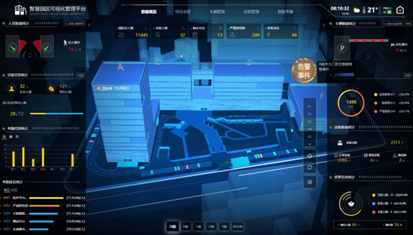 数据概览统计:系统可以查看平台运行数据,包括人数统计、车辆统计、访客统计、机动车识别信息、园区考勤统计、设备报警等信息,通过可视化数据魔墙的方式,直观了解当前整体区域的管理情况。